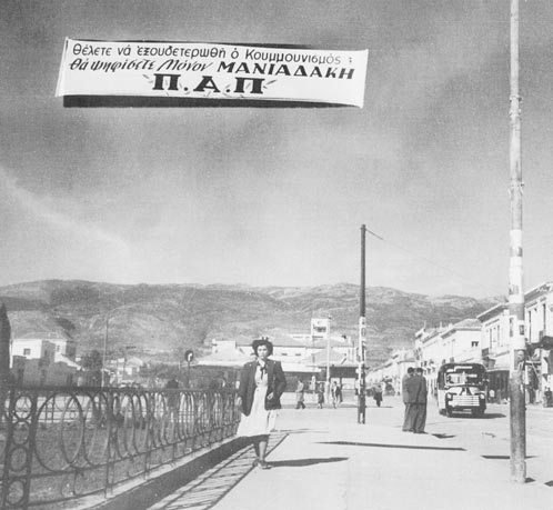 Την 5η Μαρτίου 1950, διεξήχθη η πρώτη εκλογική αναμέτρηση μετά την επίσημη λήξη του Εμφυλίου και η δεύτερη μετά την Κατοχή. Το «ιπτάμενο» προεκλογικό πανό της ΠΑΠ (Πολιτική Ανεξάρτητος Παράταξις) του Κων. Μανιαδάκη, στην οδό Αριστομένους, είναι αποτέλεσμα φωτομοντάζ. Παρότι η ΠΑΠ δεν κατόρθωσε να μπει στη Βουλή, ήρθε δεύτερη σε ψήφους στη Μεσσηνία (μετά το Λαϊκό Κόμμα του Κων. Τσαλδάρη).