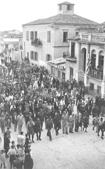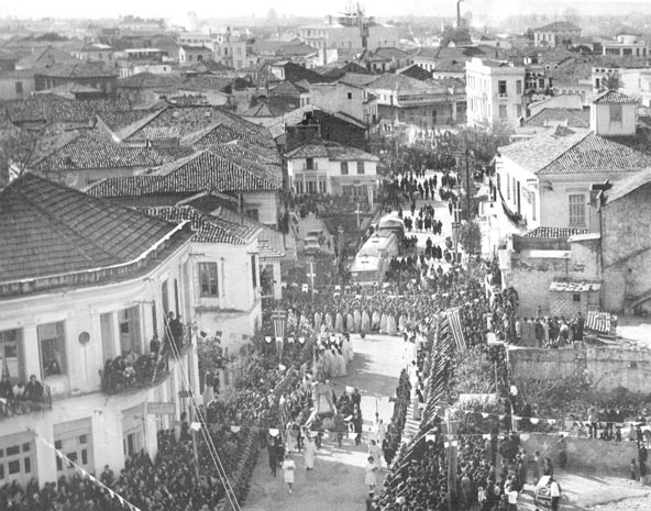 Κόσμος ανεβαίνει την οδό Υπαπαντής, προς τον ομώνυμο μητροπολιτικό ναό, όπου θα τελεσθεί δοξολογία. Στο μέσο της πρώτης σειράς, τρίτος και τέταρτος από αριστερά, διακρίνονται οι Ωρίων (Γιάννης Μιχαλόπουλος), καπετάνιος της ΙΧ Ταξιαρχίας του ΕΛΑΣ, και Παναγιώτης Κωστόπουλος, αντισυνταγματάρχης και διοικητής της ΙΧ Ταξιαρχίας. Ο Κωστόπουλος βαδίζει με τη βοήθεια μπαστουνιού, καθώς είχε τραυματισθεί στην επιχείρηση κατάληψης της Καλαμάτας.
