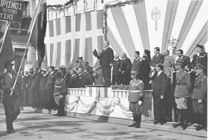 Ο Ιωάννης Μεταξάς στην ειδική εξέδρα που είχε στηθεί μπροστά από την ημιτελή οικία Καράμπελα, 25 Απριλίου 1939