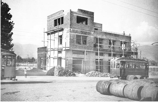 Κτίζεται το Λιμενικό Ταμείο (πρόσθια όψη, προς νότο). Δύο τραμ διασταυρώνονται σε αυτό το σημείο.