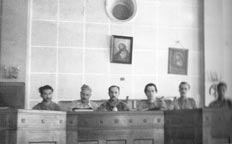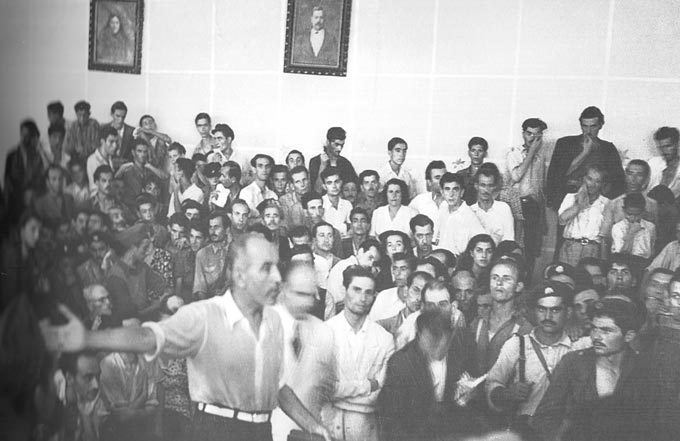 Στο εσωτερικό της Λαϊκής Σχολής. Ο όρθιος άνδρας με το πουκάμισο και το προτεταμένο χέρι είναι ο κατοχικός δήμαρχος Ηλίας Καρατζάς, κατηγορούμενος για προδοσία.