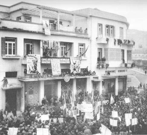 Το πολεμικό κλίμα των ημερών υπογραμμίζουν τα μεγάλα πλακάτ της ΕΠΟΝ στην πρόσοψη του κτηρίου.