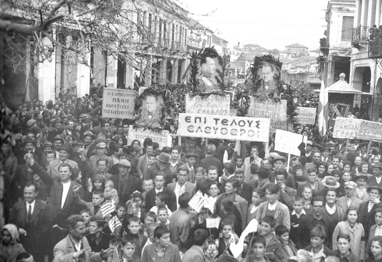 Στη φωτογραφία, κορίτσια μπροστά από τον μητροπολιτικό ναό της Υπαπαντής κρατούν στεφάνια που προορίζονται για τους τάφους των νεκρών ανταρτών στη Φραγκόλιμνα. Δίπλα στην είσοδο του ναού έχει τοιχοκολληθεί η επιγραφή «Κανένας νέος, νέα και αητόπουλο έξω από τις γραμμές της ΕΠΟΝ».