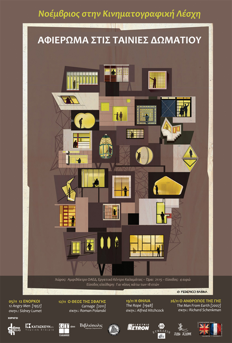 Είτε αυτό γίνεται τόπος εγκλήματος στην φαντασία του Αλφρεντ Χίτσκοκ (19/11) "Η θηλιά" [1948]), είτε τόπος για να ξεδιπλωθεί ένα θεατρικό δράμα δωματίου (12/11) "Ο θεός της σφαγής" [2011]), οι ταινίες δωματίου θα αποτελούν για πάντα μια τρομερή άσκηση ύφους για κάθε σκηνοθέτη, και μια δυσκολεπίλυτη εξίσωση ως αίνιγμα για κάθε σινεφίλ.