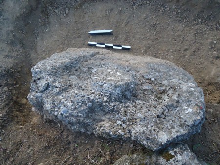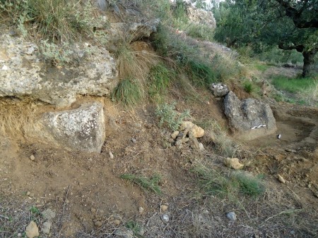 Από την αφαίρεση των χαλαρών ανοιχτοκάστανων χωμάτων που κάλυπταν το κατώτερο μη ορατό τμήμα του λαξευμένου βραχόλιθου, συλλέχθηκε αρκετός αριθμός μελαμβαφών οστράκων ελληνιστικών χρόνων καθώς και τμήματα κεράμων στέγης καλής όπτησης, που πιθανώς προέρχονται από αρχαίο οικοδόμημα που εντοπίστηκε στο πρανές της πλαγιάς, σε ελάχιστη απόσταση νότια από τον λαξευμένο βράχο. Από το οικοδόμημα αυτό είναι ορατό τμήμα τοίχου, κατεύθυνσης Β-Ν, επιμελημένης κατασκευής, αποτελούμενο από διπλή σειρά ορθογώνιων λιθοπλίνθων κτισμένων κατά το ισοδομικό σύστημα.