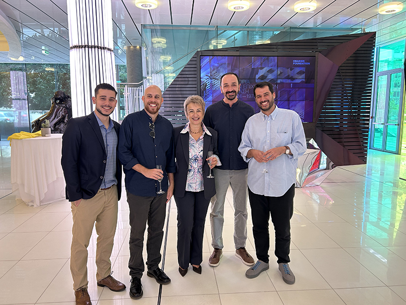 Η Τζελίνα Χαρλαύτη με μέρος της νεανικής ομάδας των υποψηφίων διδακτόρων του Πανεπιστημίου Κρήτης που καταγράφουν και ταξινομούν το Αρχείο Ωνάση στην πρώτη παρουσίαση του βιβλίου στη Στέγη του Ιδρύματος Ωνάση, τον Οκτώβριο 2023. Από αριστερά: Γιάννης Διαμαντόπουλος, Άγγελος Δρουγούτης, Γιάννης Γονατίδης και Άλκης Καποκάκης.
