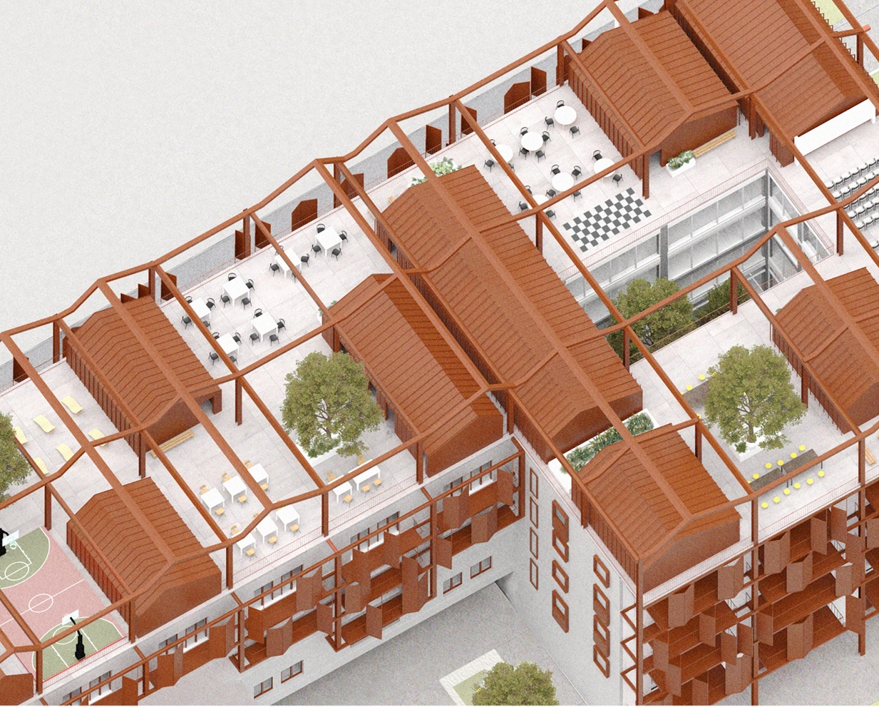 Ναι, η κατασκευή που συνοψίζει τη φιλοσοφία του έργου μας είναι τόσο το στέγαστρο στο δώμα όσο και το μουσείο. Το στέγαστρο αγκαλιάζει το δώμα, μετατρέποντάς το σε έναν ενιαίο δημόσιο και κοινόχρηστο χώρο, ενώ εκτείνεται και στις όψεις, δημιουργώντας εξώστες στους ξενώνες των φοιτητών. Το υλικό που επιλέγουμε είναι τα φύλλα τιτανιούχου ψευδαργύρου που ενισχύουν τη σχέση παλιού και νέου, με την επιλεγμένη απόχρωση να παραπέμπει στον χαρακτήρα του εργοστασίου. Στο βόρειο τμήμα, το μουσείο οργανώνεται ως «κατασκευή μέσα στην κατασκευή»: το εξωτερικό κέλυφος διατηρείται και αποκαθίσταται, ενώ μια νέα μεταλλική δομή αναδεικνύει την αρχική μορφή. Το μουσείο επενδύεται επίσης με φύλλα ψευδαργύρου, προσδίδοντας σύγχρονη διάσταση και ενισχύοντας τον διάλογο μεταξύ ιστορίας και νέας παρέμβασης.