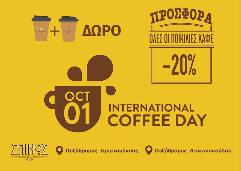 Με αφορμή τη Διεθνή Ημέρα Καφέ, σας περιμένουμε την Παρασκευή 1 Οκτωβρίου στα καφεκοπτεία ΣΠΙΝΟΣ για να "γιορτάσουμε" παρέα!