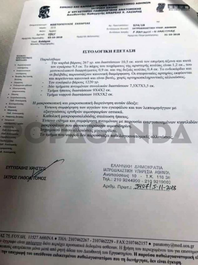 Σύμφωνα με την εργαστηριακή έκθεση της τοξικολογικής εξέτασης του θύματος, που φέρνει στη δημοσιότητα το popaganda.gr δεν βρέθηκε ίχνος από ναρκωτικά στο αίμα του.