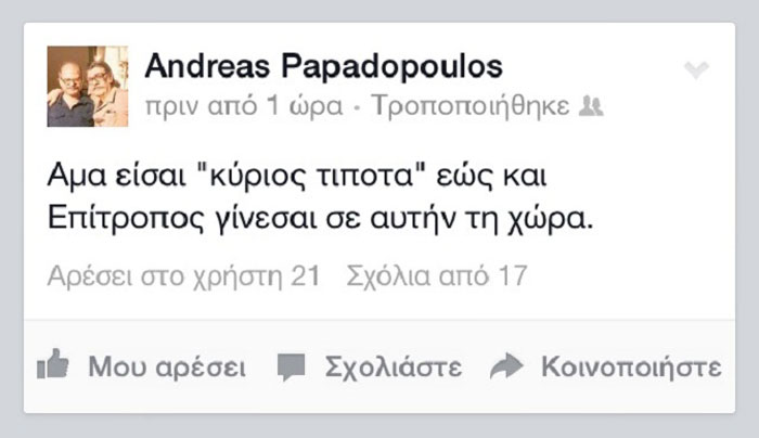 «Άμα είσαι "κύριος τίποτα" έως και επίτροπος γίνεσαι σε αυτή τη χώρα», έγραψε χαρακτηριστικά. Ωστόσο, λίγο μετά κατέβασε την συγκεκριμένη ανάρτηση.