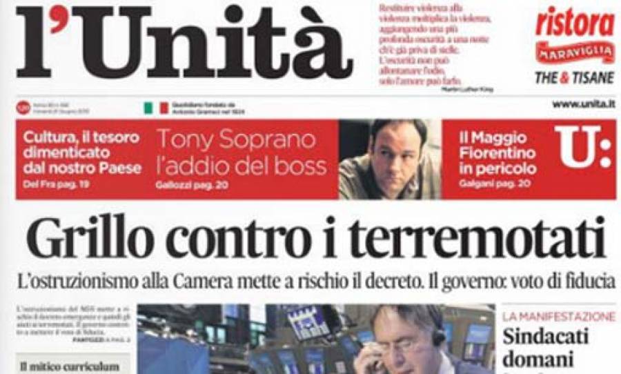"Δολοφόνησαν την L'Unità ", είναι ο σημερινός πρωτοσέλιδος τίτλος της. Εκτός από ένα τρισέλιδο αφιερωμένο στους λόγους διακοπής της κυκλοφορίας της και μία ολοσέλιδη καταχώρηση του διαδικτυακού της βιβλιοπωλείου, οι υπόλοιπες σελίδες της 20σέλιδης έκδοσης είναι λευκές.