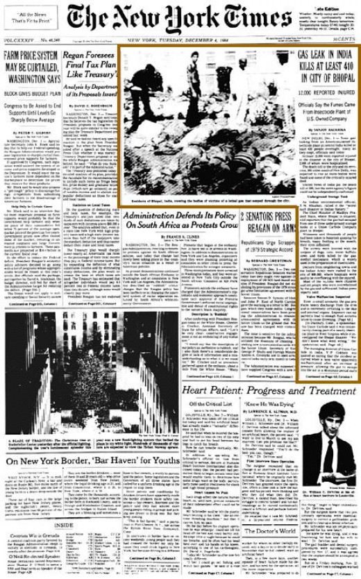 Στις 3 Δεκεμβρίου του 1984 πάνω από 40 τόνοι ισοκυανικού μεθυλίου, ενός χημικού εκατοντάδες φορές τοξικότερου από το υδροκυάνιο, διέρρευσαν από ένα εργοστάσιο φυτοφαρμάκων στο Μποπάλ της Ινδίας, σκοτώνοντας άμεσα τουλάχιστον 3.800 ανθρώπους και προκαλώντας σημαντικές βλάβες και πρόωρη θνησιμότητα σε ακόμη περισσότερους.