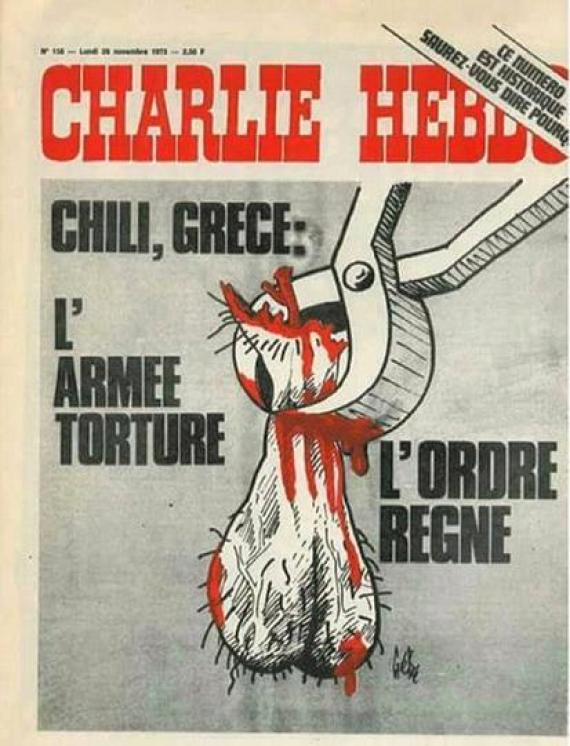 Με αυτό το εξώφυλλο κυκλοφόρησε το Charlie Hebdo, στις 26 Νοεμβρίου του 1973, λίγες ημέρες μετά την εξέγερση του Πολυτεχνείου στην Ελλάδα.