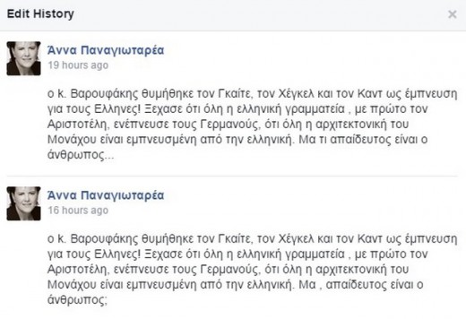H Άννα Παναγιωταρέα, δημοσιογράφος και εκπρόσωπος Τύπου της προηγούμενης κυβέρνησης για τον τάφο της Αμφίπολης, έγραψε στο facebook: «o k. Βαρουφάκης θυμήθηκε τον Γκαίτε, τον Χέγκελ και τον Καντ ως έμπνευση για τους Ελληνες! Ξεχασε ότι όλη η ελληνική γραμματεία , με πρώτο τον Αριστοτέλη, ενέπνευσε τους Γερμανούς, ότι όλη η αρχιτεκτονική του Μονάχου είναι εμπνευσμένη από την ελληνική. Μα τι απαίδευτος είναι ο άνθρωπος...» Στη συνέχεια, μετά από αντιδράσεις, τροποποίησε την ανάρτηση της ως προς το «απαίδευτος» προσθέτοντας ένα ερωτηματικό. «o κ. Βαρουφάκης θυμήθηκε τον Γκαίτε, τον Χέγκελ και τον Καντ ως έμπνευση για τους Ελληνες! Ξεχασε ότι όλη η ελληνική γραμματεία , με πρώτο τον Αριστοτέλη, ενέπνευσε τους Γερμανούς, ότι όλη η αρχιτεκτονική του Μονάχου είναι εμπνευσμένη από την ελληνική. Μα, απαίδευτος είναι ο άνθρωπος;» έγραψε.