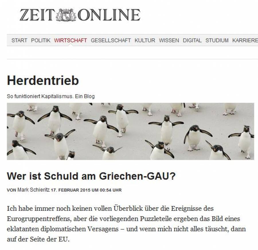 «Ποιος ευθύνεται για την αποτυχία της διαπραγμάτευσης για την Ελλάδα;» είναι ο τίτλος άρθρου στο μπλογκ της εβδομαδιαίας εφημερίδας «Die Zeit» στο οποίο τίθενται τα ερωτήματα: «Γιατί αποσύρθηκε το προσχέδιο του Μοσκοβισί και υπό την πίεση τίνος;». Σε άρθρο της εφημερίδας, υπό τον τίτλο «Πρόγραμμα ενάντια στη θέληση των Ελλήνων ψηφοφόρων» επισημαίνεται ότι οι υπουργοί Οικονομικών της Ευρωζώνης τηρούν σκληρή στάση και σπρώχνουν την Ελλάδα όλο και περισσότερο στη γωνία. «Η κυβέρνηση πρέπει να συνεχίσει το τρέχον πρόγραμμα. Ένα αδιέξοδο για τον Τσίπρα» γράφει η συντάκτρια.