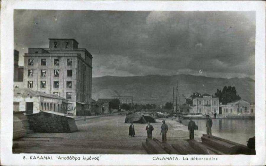 Στο βάθος μοναδικό κτήριο το συγκρότημα Λιμεναρχείου - Τελωνείου, ενώ αριστερά δεσπόζει το κτήριο των μύλων "Ευαγγελίστριας" και μακρύτερα διακρίνονται οι μύλοι "Φεραδούρου - Αποστολάκη". Λίγα εμπορεύματα και ανάμεσα στους λιγοστούς ανθρώπους ο λιμενικός.