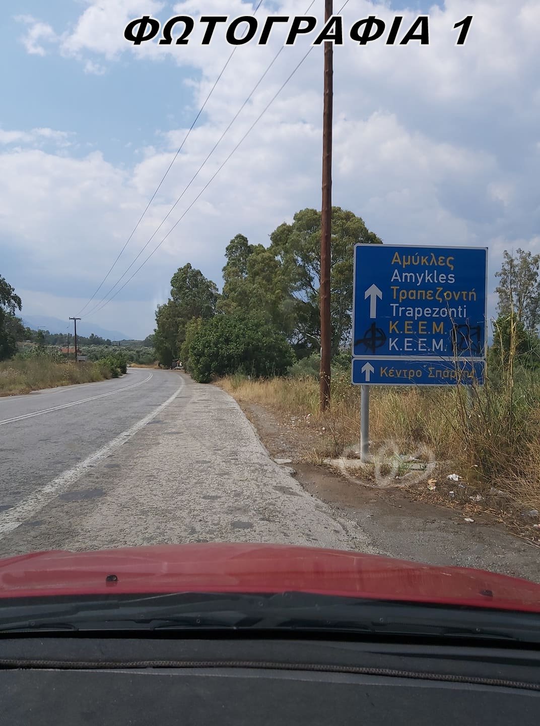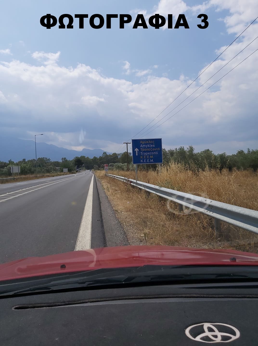 Αμέσως μετά τον κόμβο και προς το Κ.Ε.Ε.Μ. βλέπει μια τρίτη πινακίδα (βλ. φωτ. 3) που αναγράφονται: «Αμύκλες Τραπεζοντή Κ.Ε.Ε.Μ.», και στην οποία απουσιάζει η Σπάρτη!...