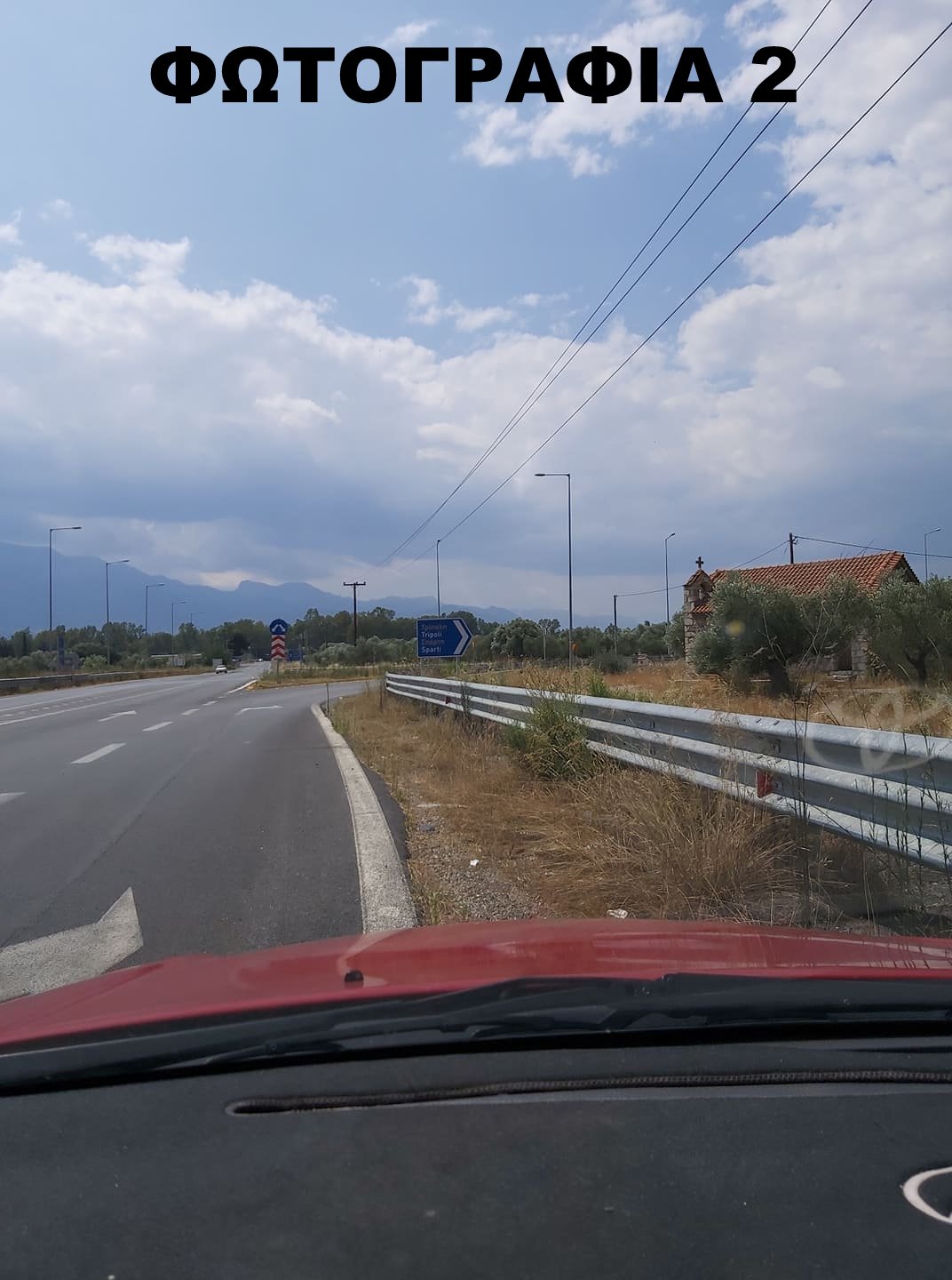 Συνεχίζοντας προς τον κόμβο, ακριβώς στην είσοδο του δρόμου της παράκαμψης, βλέπει μια δεύτερη πινακίδα (βλ. φωτ. 2) που αναγράφονται: «Τρίπολη Σπάρτη».