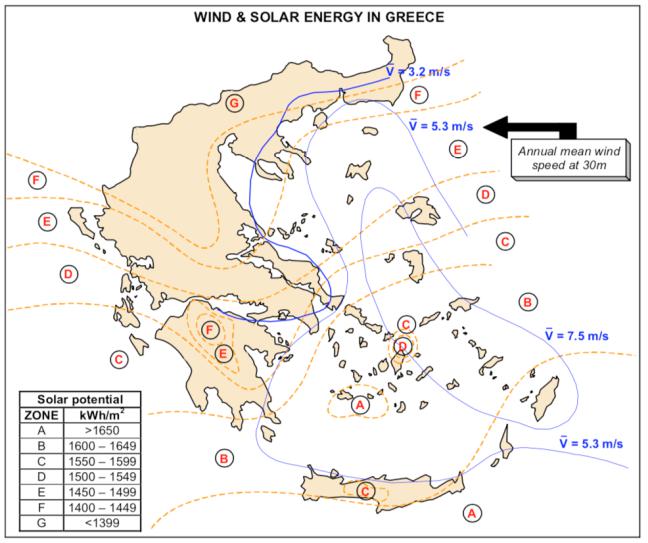 Στον ακόλουθο χάρτη εμφανίζονται αναλυτικά οι βέλτιστες ζώνες έντασης ανέμου και ηλιοφάνειας στην ελληνική επικράτεια (ηπειρωτική χώρα και θάλασσα), όπου θα μπορούσαν να δημιουργηθούν τα αιολικά πάρκα και οι φωτοβολταϊκοί σταθμοί.
