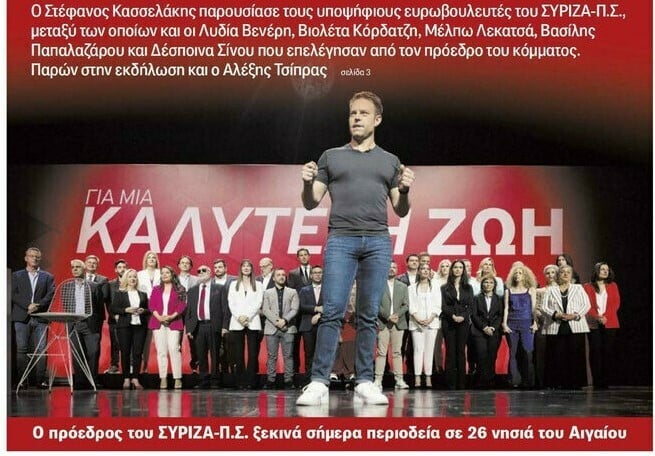 Θα μπορούσε να είναι μία εικόνα από την ομιλία στο Σύνταγμα, αλλά θα πρέπει να πάμε λίγο πιο πίσω. Στις 19 Απριλίου ο ΣΥΡΙΖΑ, στην πιο σημαντική κομματική προεκλογική εκδήλωση, παρουσίασε τους υποψήφιους ευρωβουλευτές. Το πρωτοσέλιδο της Αυγής την επόμενη μέρα, η φωτογραφία που επιλέχθηκε, περιγράφει με λεπτομέρειες τι είναι ο Στέφανος Κασσελάκης και ποιοι είναι οι στόχοι του.