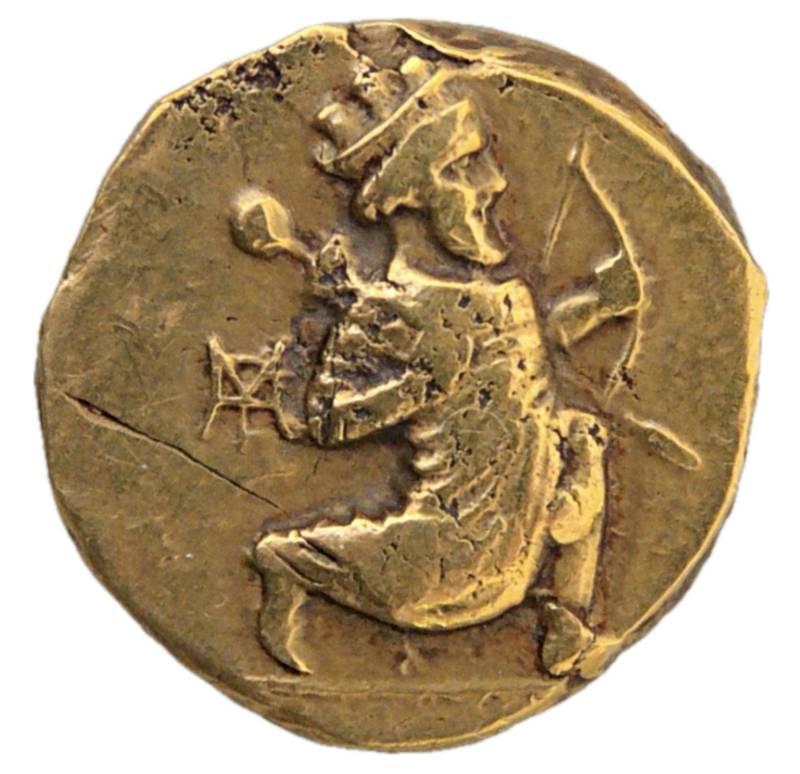 [Φωτογραφία: Διπλός δαρεικός του Αρταξέρξη Β΄, που κόπηκε στη Βαβυλώνα περί το 330-300 π.Χ.· στη μία όψη ο Πέρσης βασιλιάς με τόξο. Cabinet des médailles Paris]