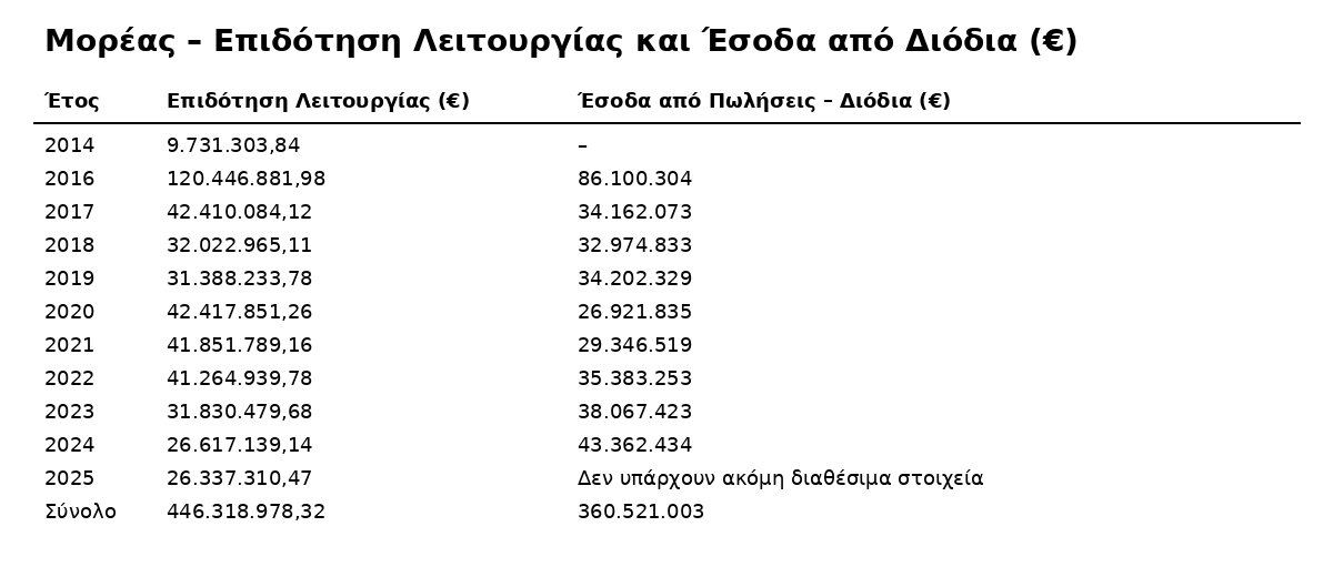 Για τις απώλειες εισοδήματος των αγροτών από φυσικές καταστροφές, την αισχροκέρδεια εμπόρων και μεσαζόντων, όλες οι κυβερνήσεις αρνούνται πεισματικά την ουσιαστική αναπλήρωση. Για τον «Μορέα», αντίθετα, η αναπλήρωση εσόδων είναι αποτυπωμένη με νόμο στη Σύμβαση Παραχώρησης. Η αρχική Σύμβαση του 2007, επί κυβέρνησης ΝΔ, προέβλεπε επιδότηση λειτουργίας περίπου 200 εκατομμυρίων ευρώ. Το 2015, επί κυβέρνησης ΣΥΡΙΖΑ - που ως αντιπολίτευση χαρακτήριζε τη ΣΔΙΤ «λεόντειο» - τροποποιήθηκε η σύμβαση και θεσπίστηκε η Πρόσθετη Επιδότηση Λειτουργίας, ύψους εκατοντάδων εκατομμυρίων ευρώ, με πρόσχημα την οικονομική κρίση και τη «βιωσιμότητα» του έργου. Τη νέα συμφωνία προετοίμασε η κυβέρνηση Σαμαρά, την υπέγραψε η κυβέρνηση Τσίπρα και την εφαρμόζει μέχρι σήμερα η κυβέρνηση Μητσοτάκη.