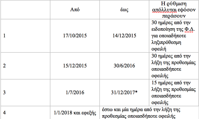 Για να γίνουμε πιο χρηστικοί επισυνάπτουμε ένα συνοπτικό πίνακα στον οποίο απεικονίζονται οι προθεσμίες ως προς την εξόφληση των ληξιπρόθεσμων οφειλών, για την απώλεια της ρύθμισης.