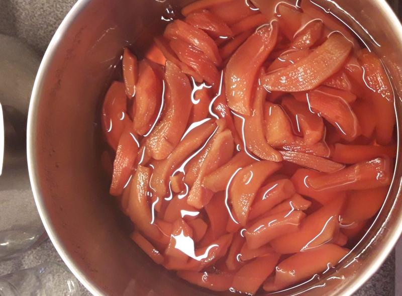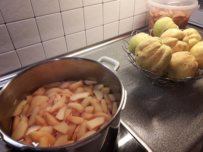 Καθαρίζουμε τα κυδώνια, αφαιρούμε την καρδιά, καθαρίζουμε την φλούδα, τα κόβουμε σε λεπτές φέτες.