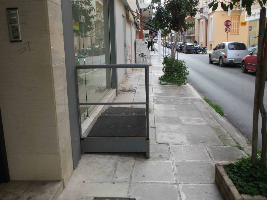 Μία ράμπα για ΑμεΑ μπροστά από την είσοδο καταστήματος που έχει κλείσει εδώ και πολλούς μήνες, παραμένει παρατημένη στο πεζοδρόμιο της Γεωργούλη, λίγο μετά την Κανάρη.
