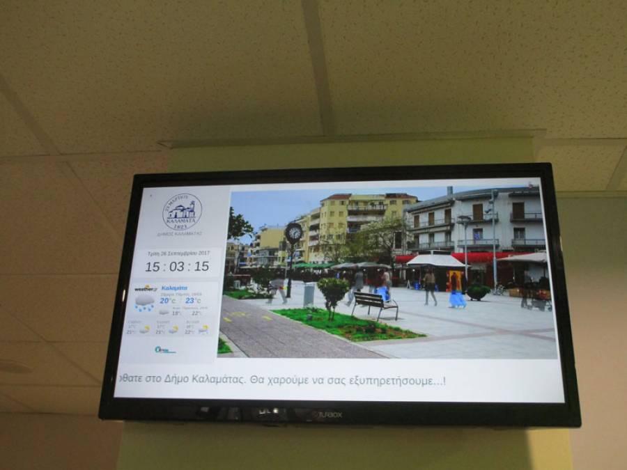 Με αυτές ο δήμος καλωσορίζει τους επισκέπτες που προσέρχονται και δηλώνει πως θα χαρεί να τους εξυπηρετήσει. Στις οθόνες παρουσιάζονται ελκυστικές εικόνες από την πόλη, από την κεντρική πλατεία, το κάστρο, την παραλία, το Πάρκο Σιδηροδρόμων, αλλά και όμορφες απόψεις από τη Βέργα και το χιονισμένο Ταΰγετο. Επίσης παρουσιάζεται η ώρα και η θερμοκρασία.