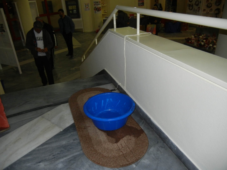 ΟΧΙ, δεν είναι κομμάτι έκθεσης μοντέρνας τέχνης. Είναι απλώς μια λεκάνη και ένα πατάκι, στα σκαλιά του Πνευματικού Κέντρου Καλαμάτας, το οποίο επισκεφθήκαμε πριν λίγες μέρες για την έκθεση βαλκανικών κειμηλίων. Εσταζε μάλλον το ταβάνι, αλλά είναι κρίμα, τόσος κόσμος μπαινοβγαίνει αυτόν τον καιρό στο κτήριο λόγω εκδηλώσεων και παζαριών!