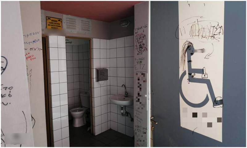 Οι τοίχοι εξωτερικά έχουν αφεθεί στην τύχη τους, ενώ τα σεξουαλικά υπονοούμενα ακόμα και στην ταμπέλα που ενημερώνει για το W.C. των ΑμεΑ αποδεικνύει πως η ανθρώπινη ανοησία είναι ακατανίκητη.