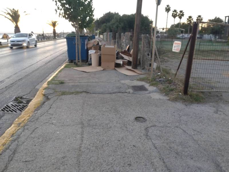 Πέρα από τα ΙΧ τα οποία έκαναν συχνά κατάληψη το καλοκαίρι, τα ανακυκλώσιμα υλικά που δεν χωρούν στον κάδο τούς αναγκάζουν να βγουν στο δρόμο για να συνεχίσουν την πορεία τους.
