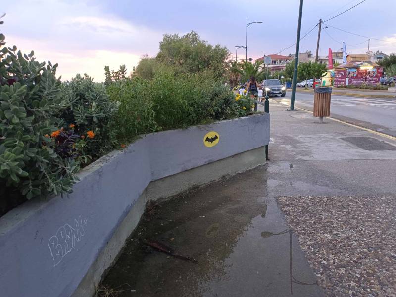 Όπως φαίνεται στη φωτογραφία, το κίτρινο πλαίσιο και η νυχτερίδα είναι η νέα τάση των «ανήσυχων καλλιτεχνών» της πόλης, οι οποίοι γνωρίζοντας πως κανείς δεν θα τους περιορίσει, κάνουν στην κυριολεξία ότι θέλουν σε δηµόσιους χώρους.