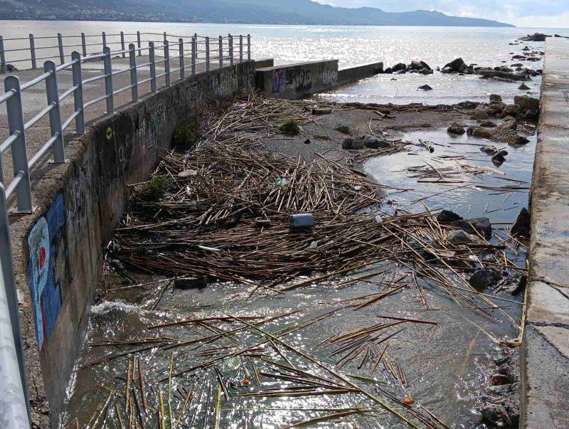 Γέμισε καλάμια η ακτή στην Ανατολική Παραλία της Καλαμάτας από τα φερτά υλικά και τη βρομιά που κατέβασαν στη θάλασσα τα ρέματα της περιοχής και προφανώς και ο μεγάλος κλειστός αγωγός ομβρίων της οδού Ηρώων.