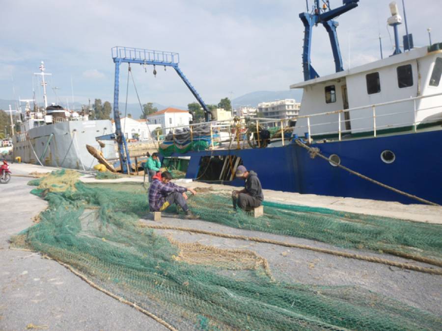 Τα δίχτυα που έχουν καταστραφεί από το ψάρεμα, επισκευάζουν, ράβουν αυτές τις μέρες οι ψαράδες στο λιμάνι της Καλαμάτας, μπροστά από τα μεγάλα αλιευτικά σκάφη.
