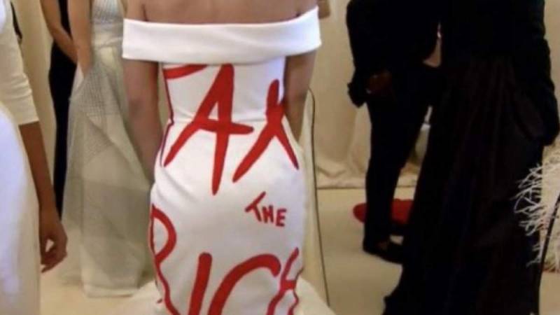 Η Οκάσιο- Κορτές έστειλε το δικό της πολιτικό μήνυμα φορώντας ένα φόρεμα Brother Vellies, στο κόκκινο χαλί του Met Gala, που ξεχωρίζει για τις ενδυματολογικές επιλογές των διασήμων. Το φόρεμα της βουλευτού των Δημοκρατικών ήταν λευκό στράπλες και στο πίσω μέρος έγραφε με κόκκινα γράμματα «Φορολογήστε τους πλούσιους».