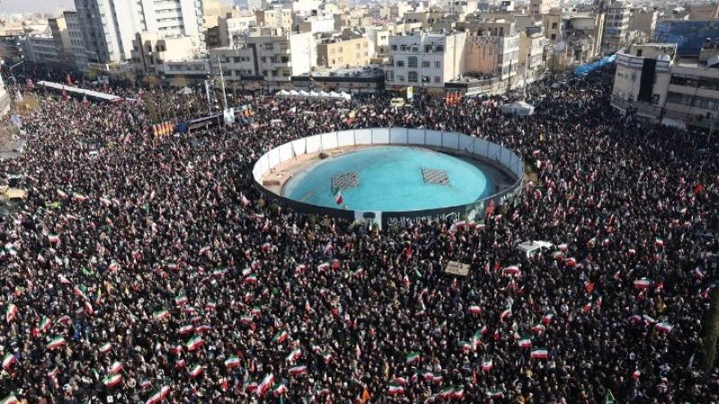 Το πλήθος συγκεντρώθηκε στην πλατεία Ενγκελάμπ στην Τεχεράνη κρατώντας ιρανικές σημαίες και πορτρέτα του Μοζτάμπα Χαμενεΐ, γιου του Αλί Χαμενεΐ, ο οποίος κατείχε προηγουμένως τη θέση αυτή και σκοτώθηκε την πρώτη ημέρα των αμερικανοϊσραηλινών πληγμάτων εναντίον του Ιράν.